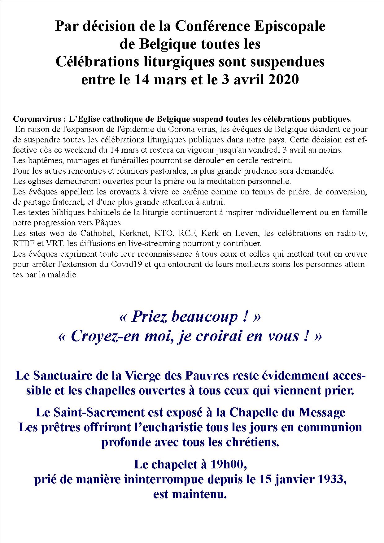 Mesures Coronavirus Par décision de la Conférence Episcopale de Belgique toutes les Célébrations liturgiques sont suspendues entre le 14 mars et le 3 mai 2020 —————————————————- Coronavirus : L’Eglise catholique de Belgique suspend toutes les célébrations publiques. En raison de Continue reading → Weiterlesen... Banneux, Mesures Coronavirus, sanctuaire, Vierge des Pauvres A la Une Leave a comment