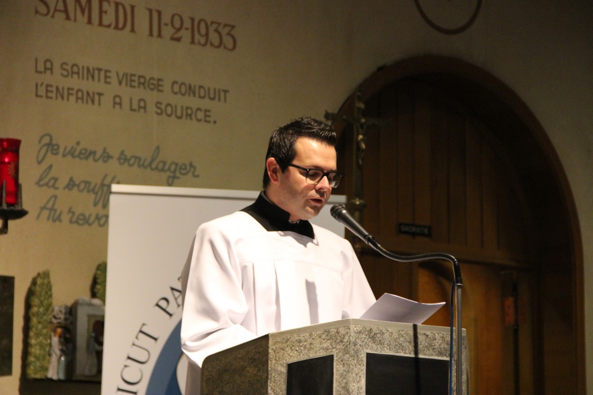 Accueil, aspersion avec l’eau de la Source, bénite, et liturgie de la Parole