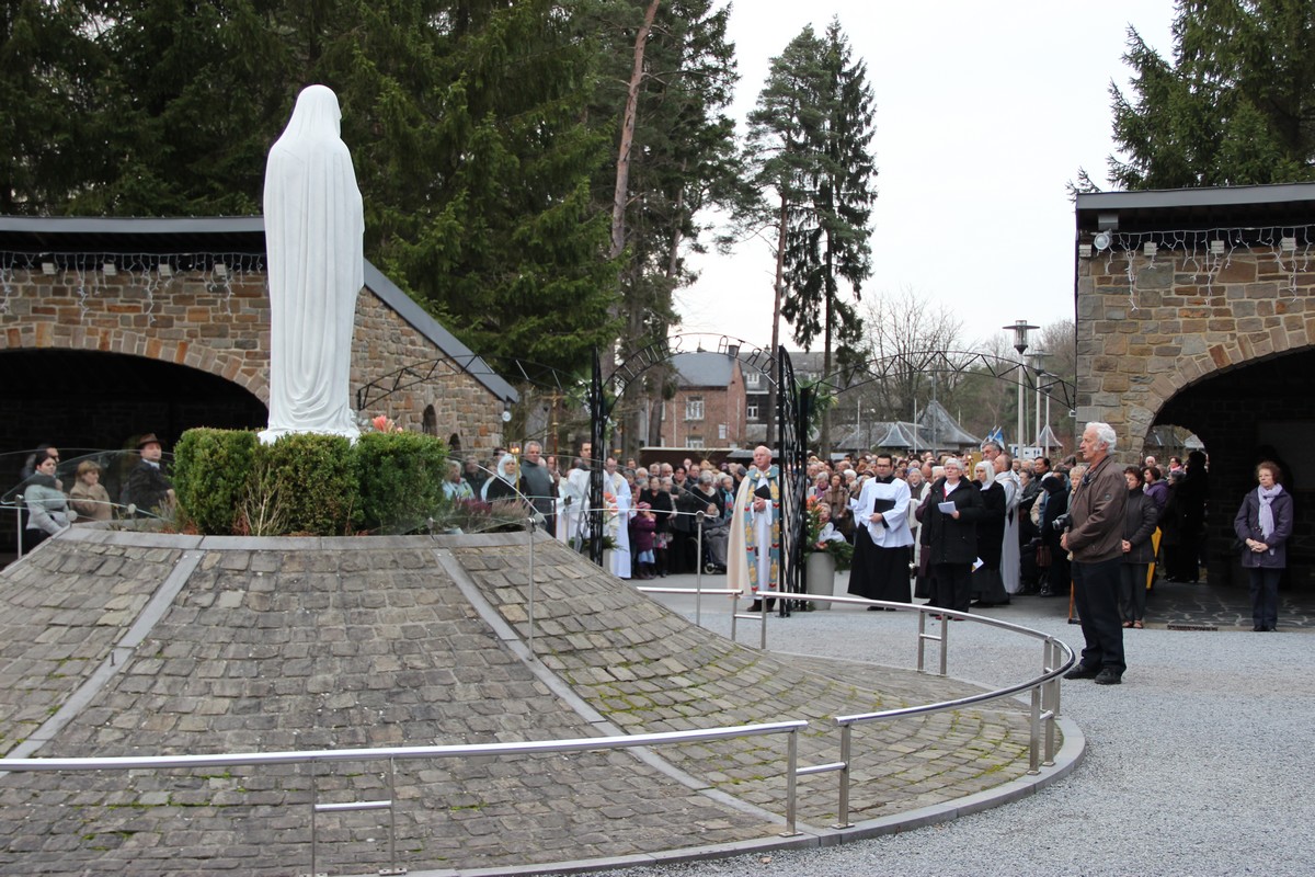 Au chant Jubilate Deo, la procession se reforme devant la Porte. Tous passent la Porte. La procession contourne la Vierge qui bénit et gagne la chapelle du Message.