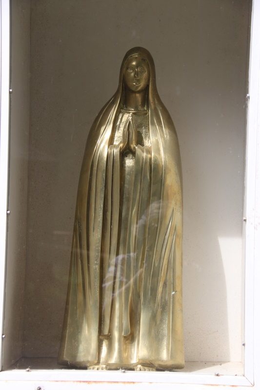 Le long du mur semi-circulaire, se dressent à distance régulière, à trois endroits, 5 colonnettes de béton, dont la surface supérieure est cruciforme : rappel des 15 mystères du Rosaire. Alors que la Vierge et Jésus trônent en majesté, Ignace, génie mystique et apôtre des temps modernes, est tout petit. L’auteur de la statue veut nous signifier que c’est en commençant petitement, simplement, qu’Ignace est devenu un grand mystique, le fondateur des jésuites, et qu’il a étendu son action à toutes les nations.