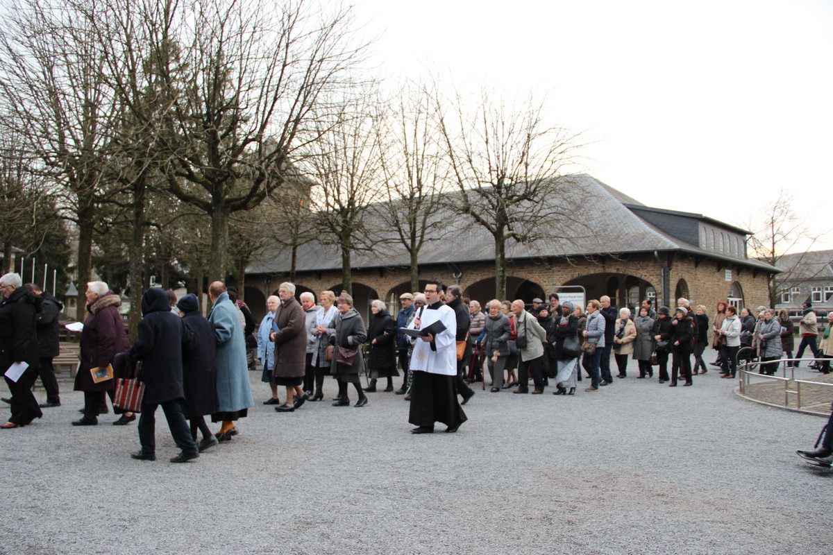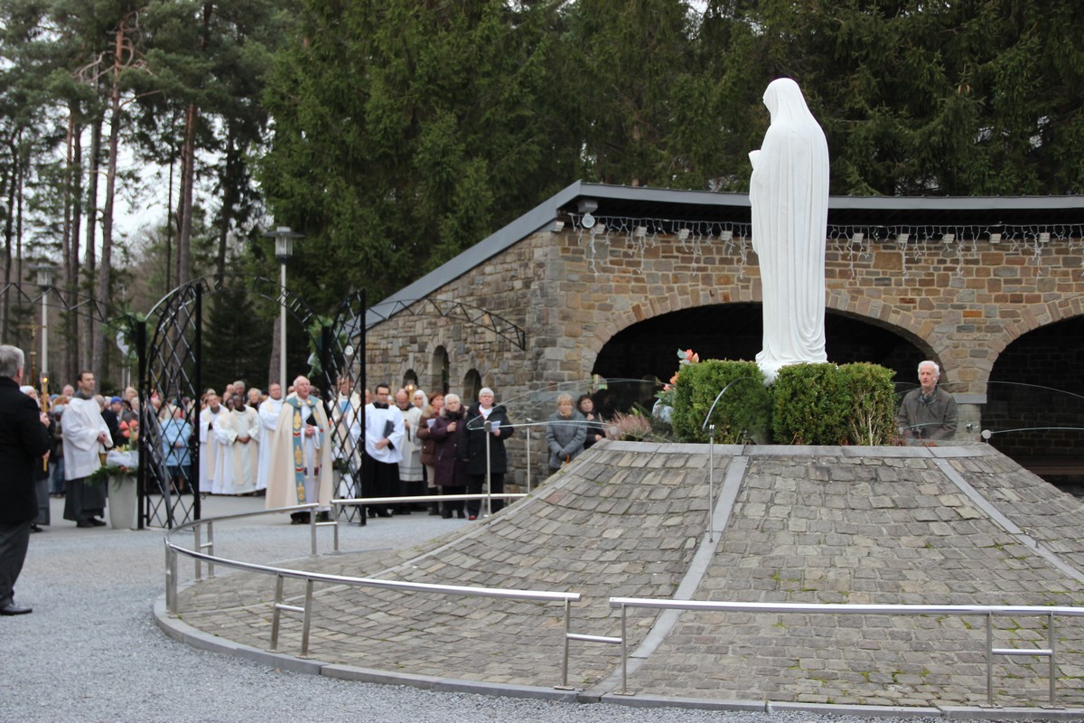 Au chant Jubilate Deo, la procession se reforme devant la Porte. Tous passent la Porte. La procession contourne la Vierge qui bénit et gagne la chapelle du Message.