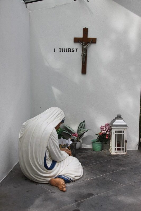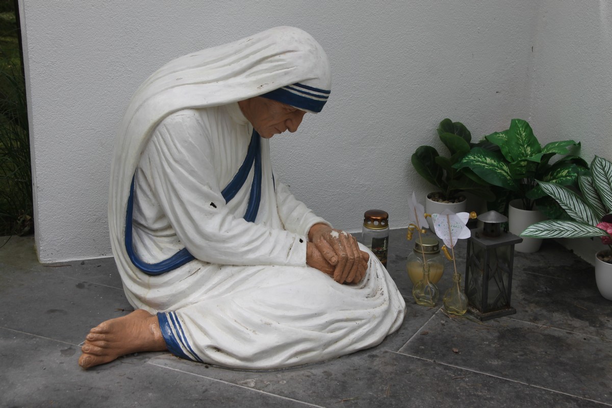 La religieuse dans son coin de prière, comme Marie, nous encourage à prier beaucoup.