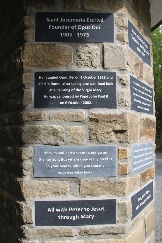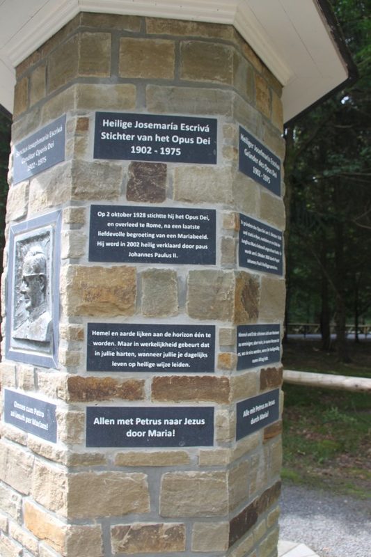 Le long du mur semi-circulaire, se dressent à distance régulière, à trois endroits, 5 colonnettes de béton, dont la surface supérieure est cruciforme : rappel des 15 mystères du Rosaire. Alors que la Vierge et Jésus trônent en majesté, Ignace, génie mystique et apôtre des temps modernes, est tout petit. L’auteur de la statue veut nous signifier que c’est en commençant petitement, simplement, qu’Ignace est devenu un grand mystique, le fondateur des jésuites, et qu’il a étendu son action à toutes les nations.