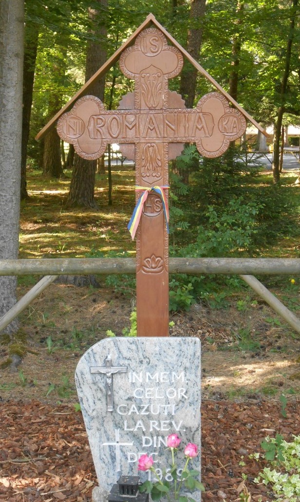 Sur une pierre, au pied de la croix, est écrit le texte suivant : En souvenir des martyrs et des héros, victimes du totalitarisme athée. Des exilés roumains en Belgique – Banneux 1995.