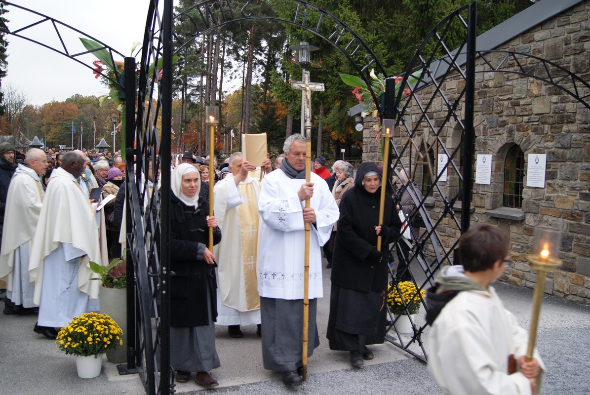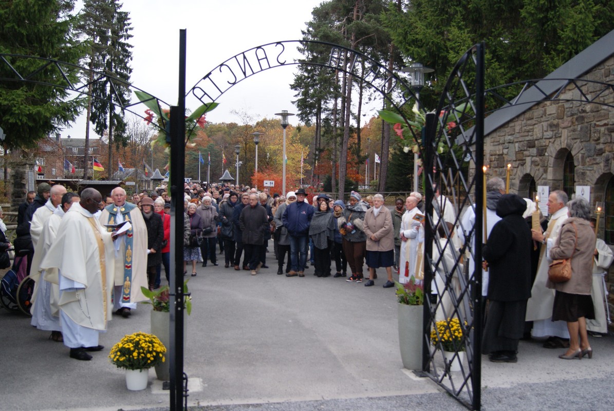 Le Recteur invite toute l’assemblée à passer la Porte Sainte, avant de terminer la procession à la Chapelle du Message où la messe sera célébrée.